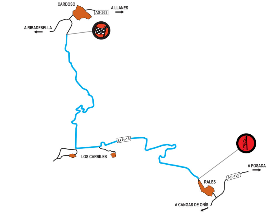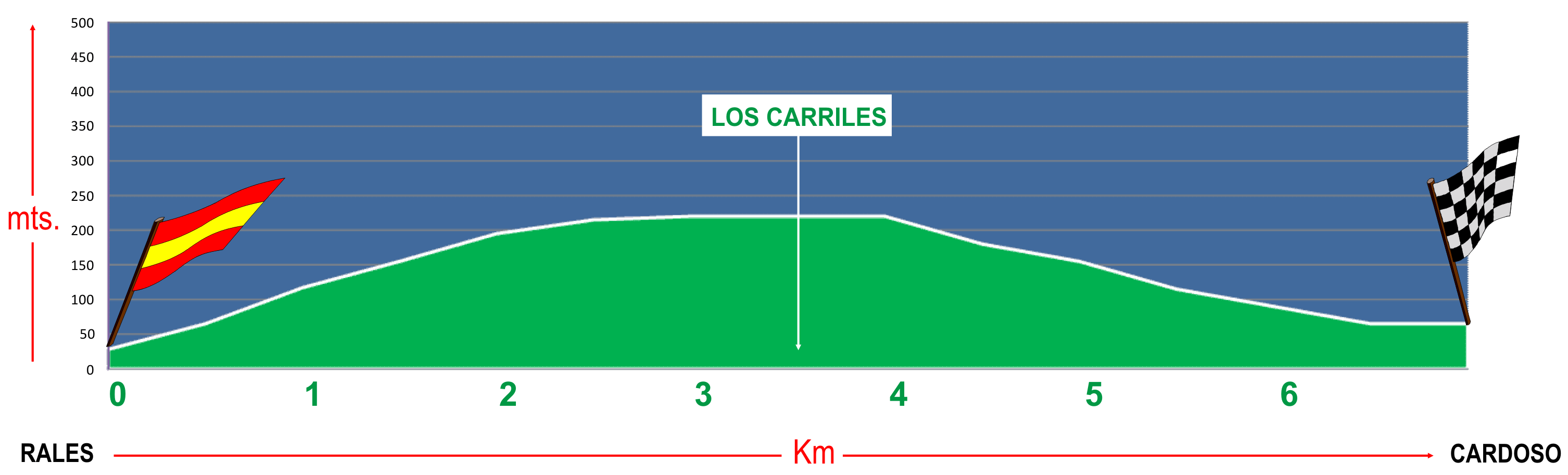 Dicha ascension termina en una recta donde se ubicara un obstaculo para reducir la velocidad de llegada al cruce de Los Carriles, a partir del cual comienza un descenso muy tecnico al pueblo de Cardoso, teniendo éste varias combinaciones de curvas rapidas y paellas.